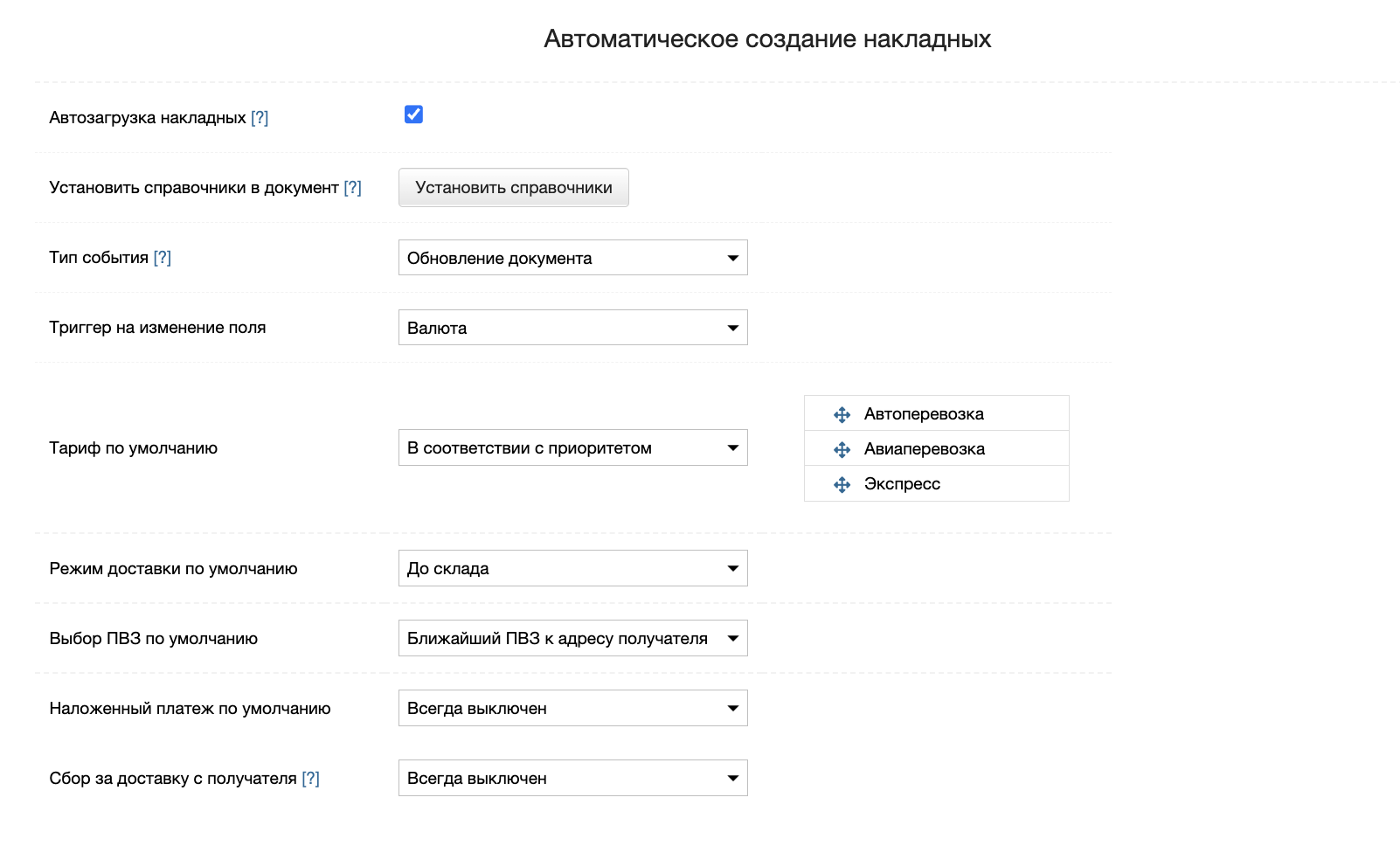Опция определяет включено ли автоматическое создание накладных для документа.