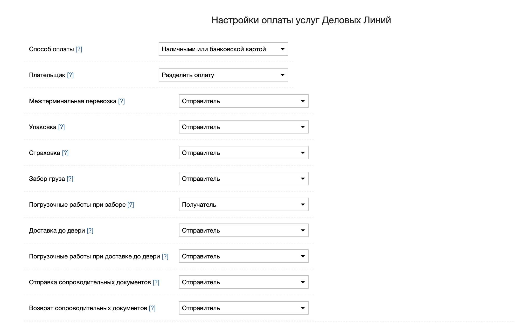 Данные настройки позволяют указать способ оплаты и плательщика по услугам Деловых Линий по умолчанию