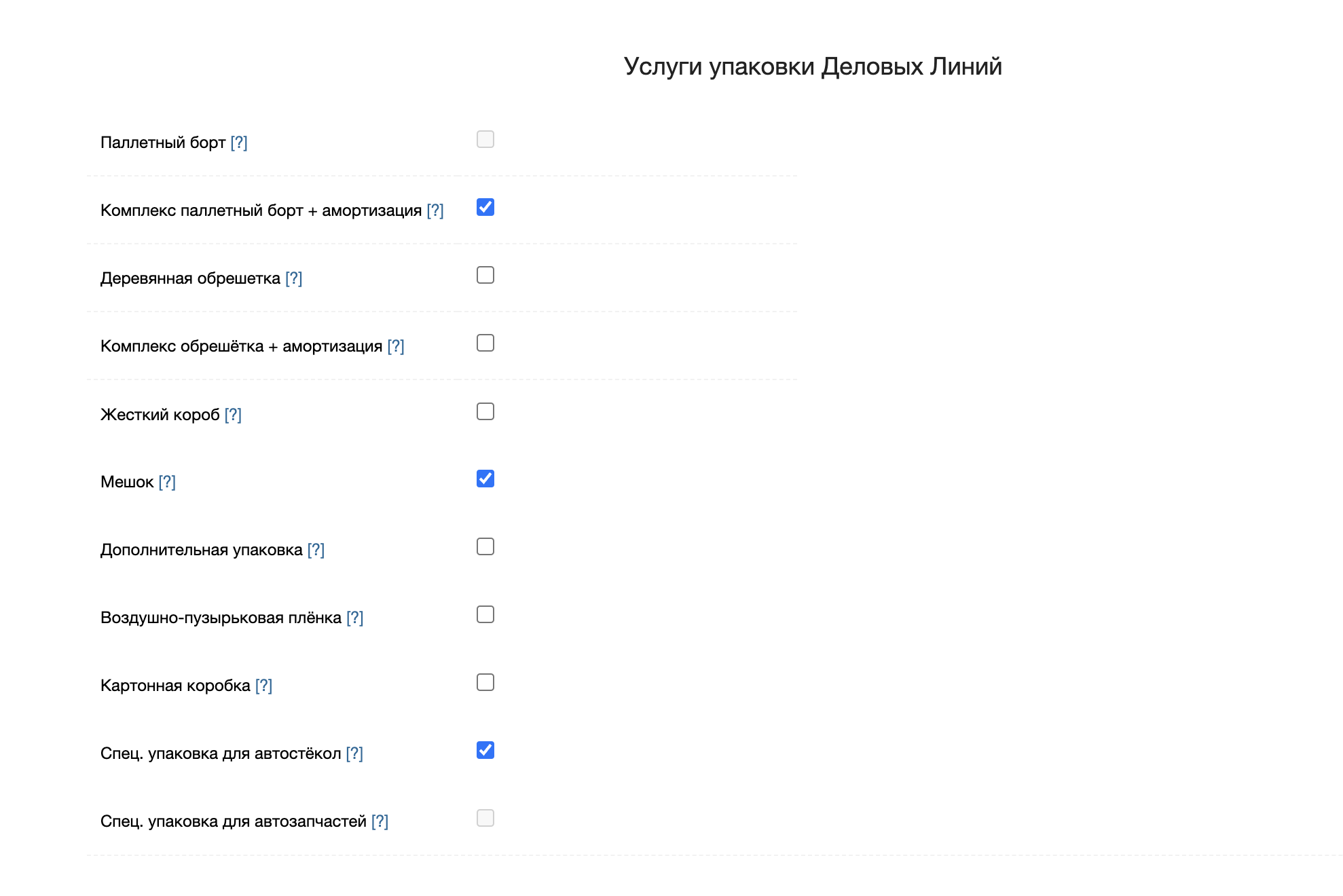 Услуги упаковки Деловых Линий, которые будут учитываться при создании накладной.