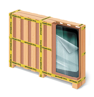 Сочетание специального картонного короба и деревянной обрешетки. Стекла, обернутые в воздушно-пузырьковую пленку, надежно крепятся внутри упаковки с помощью фиксаторов.