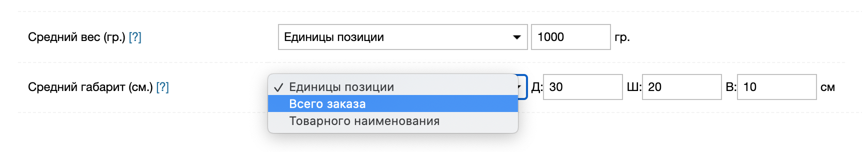 - Всего заказа. Если вы указываете средний вес на заказ 3000гр, то приложение поделит этот вес на количество позиций. Например, заказе у вас 3 товарных наименования по 1шт, но у лишь у одного нет значения веса - приложение посчитает вес этой позиции как 3000 гр / 3 = 1000гр.