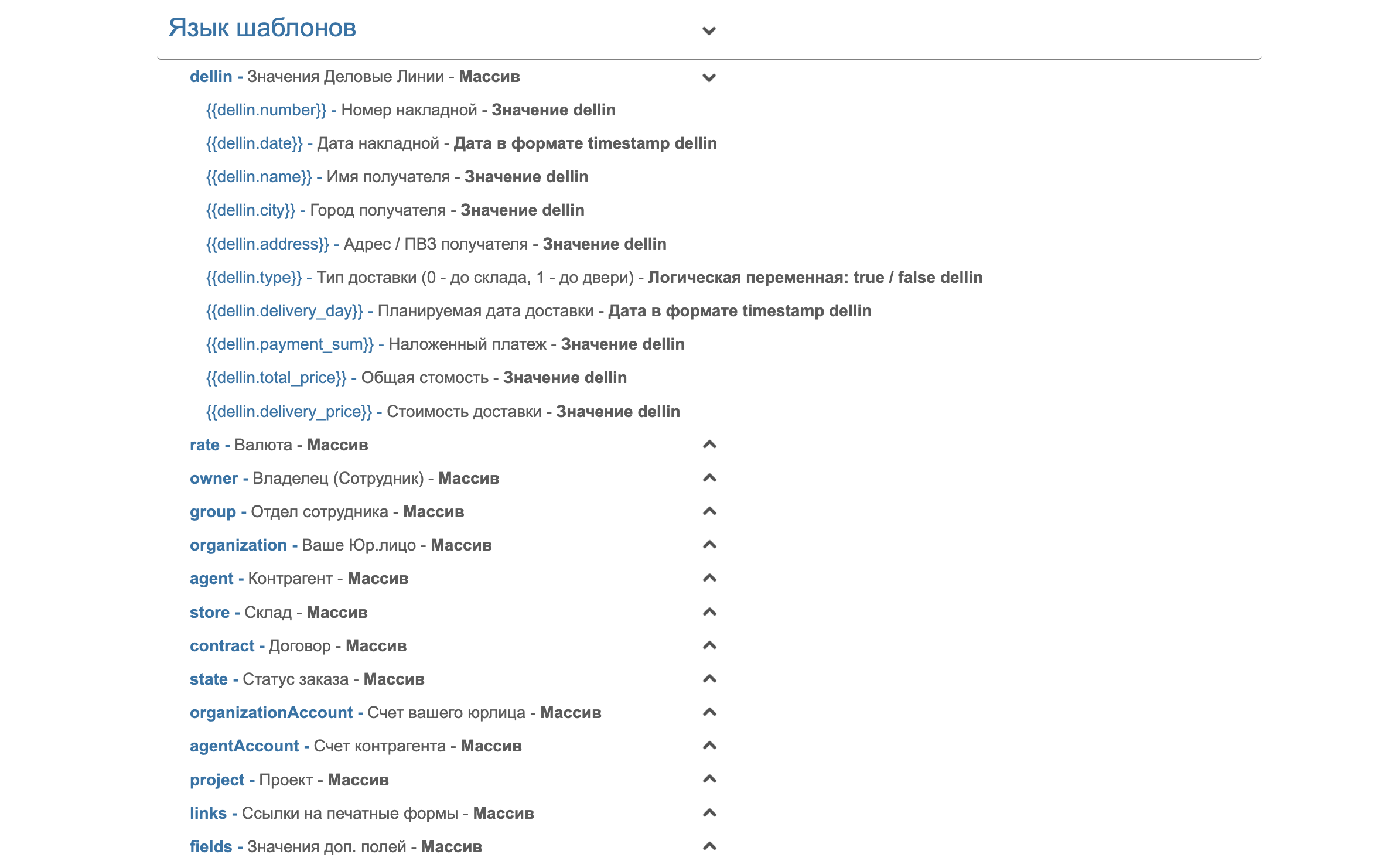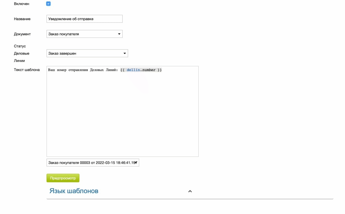 При создании шаблона для подстановки значений (например, сумма заказа, статус заказа, номер накладной) используйте язык шаблонизатора Liquid и подсказки Языка Шаблонов.