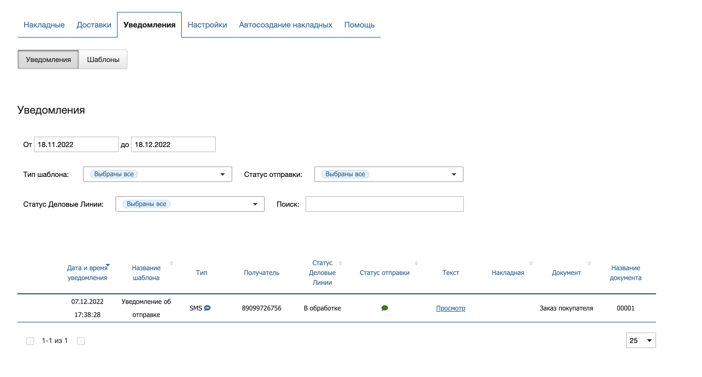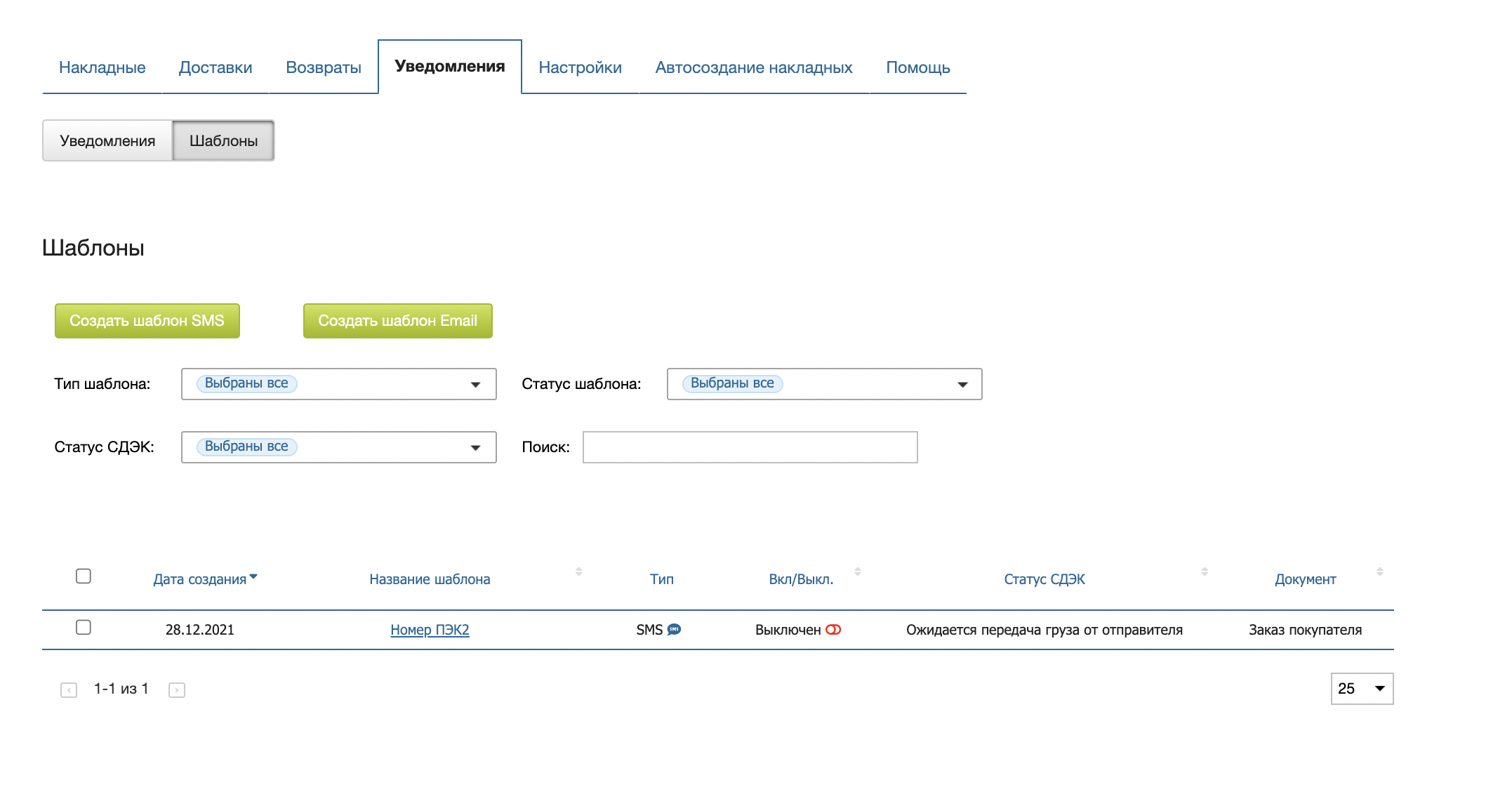 Во вкладке Уведомления отображаются все созданные SMS и E-mail уведомления клиентам, их текущие статусы отправки, тип, предпросмотр отправленного текста, раздел редактирования Шаблонов