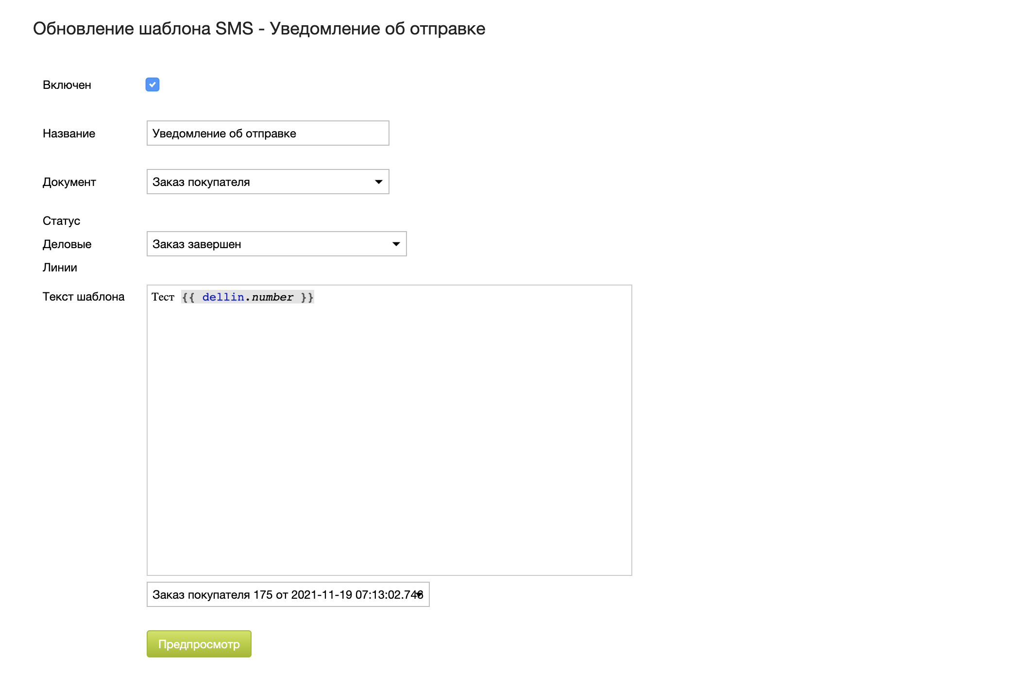 - статус Деловых Линий, на который будет срабатывать шаблон