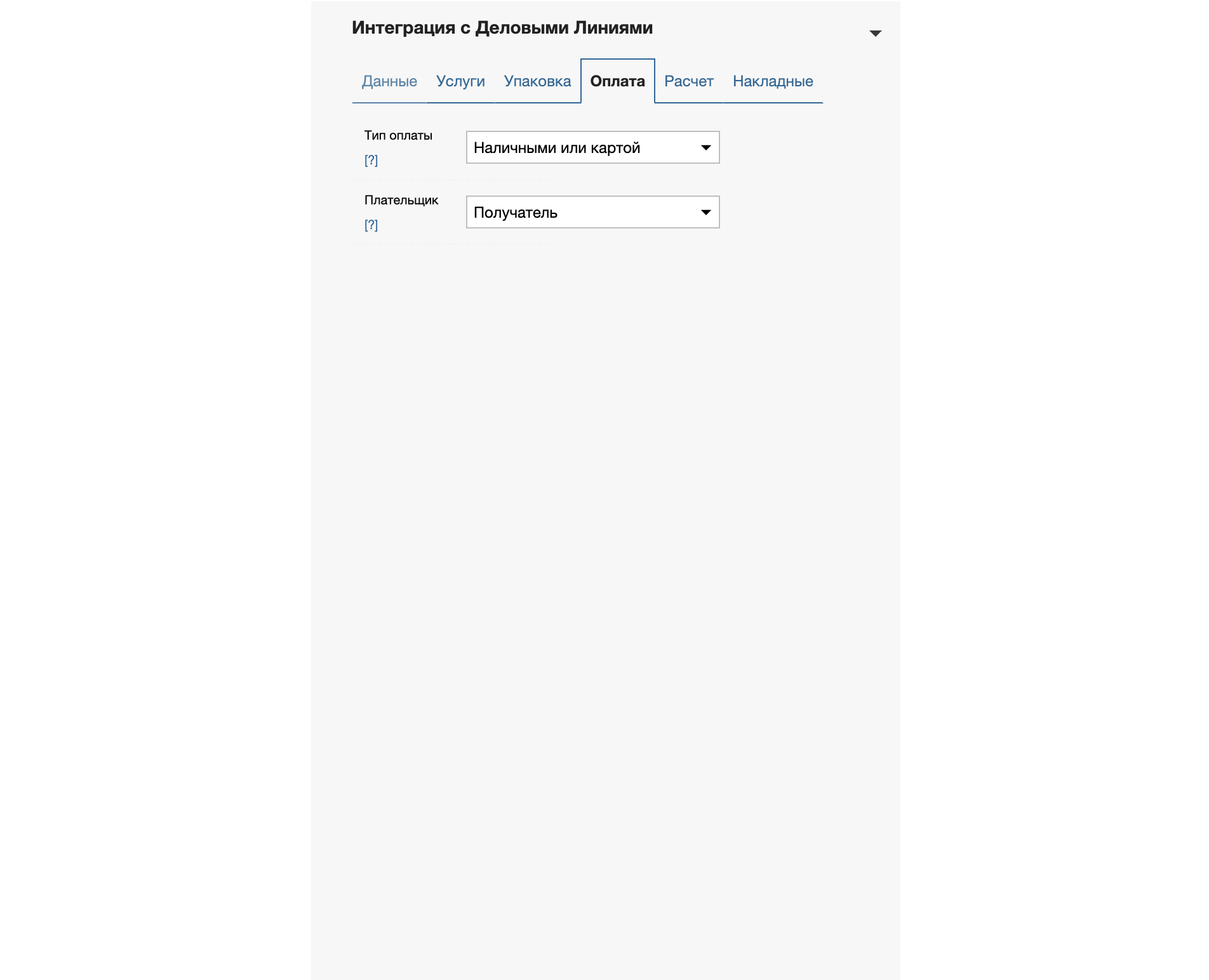 Данная опция определяет способ оплаты за услуги Деловых Линий. Доступны варианты: