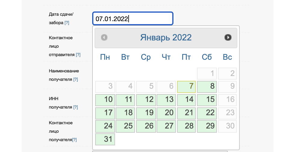 Пользователю предлагается выбрать в календаре предполагаемую дату сдачи или желаемую дату забора. Зеленым подсвечены доступные даты, серым - недоступные.