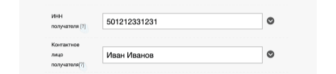 Имя контактного лица отправителя и данные его документов. Поле обязательно для заполнения, если не указан ИНН юр. лица отправителя. По клику на иконку ⬇️ разворачивается дополнительное меню с данными документа контактного лица.