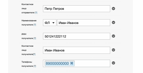 Имя контактного лица отправителя и данные его документов. Поле обязательно для заполнения, если не указан ИНН юр. лица отправителя. По клику на иконку ⬇️ разворачивается дополнительное меню с данными документа контактного лица.