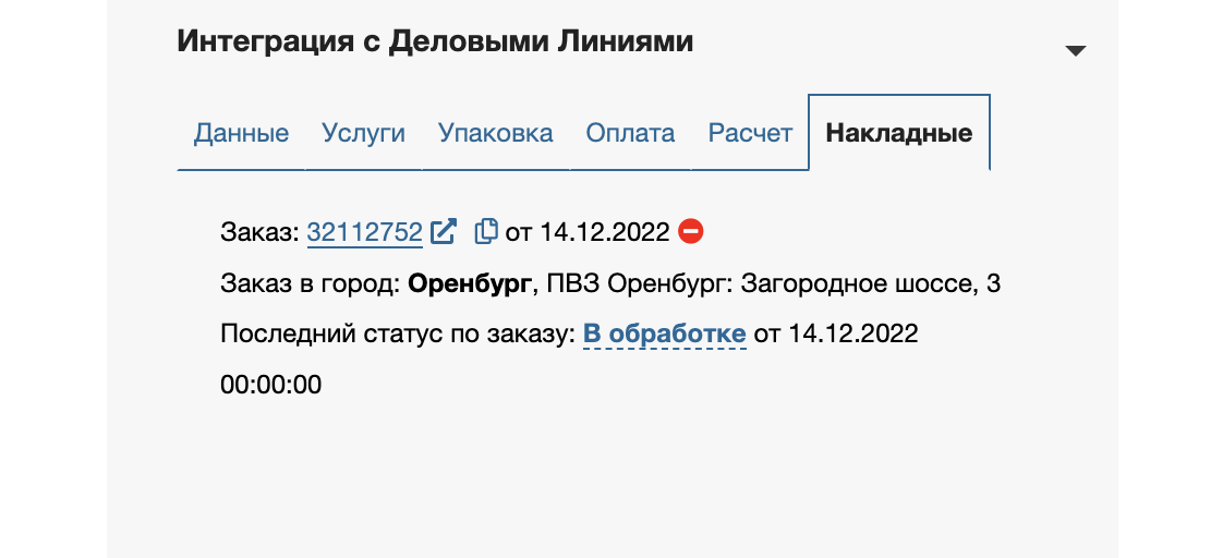 В этой части виджета выводятся все созданные по заказу накладные Деловых Линий, а также их последний статус и краткая информация